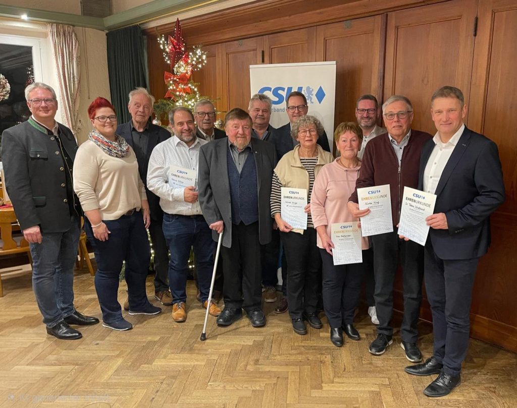 Zum Jahresabschluss des CSU-Ortsverbandes Töging durfte Ortsvorsitzender und Bürgermeisterkandidat Daniel Blaschke rund 50 Mitglieder und Gäste bei Selles Einkehr zum Müllerbräu begrüßen. Mit dabei waren unter anderem der 1. Bürgermeister und Landratskandidat Dr. Tobias Windhorst, die 2. Bürgermeisterin Renate Kreitmeier, CSU-Generalsekretär Martin Huber sowie zahlreiche Stadträtinnen und Stadträte. In seiner Ansprache bedankte sich Daniel Blaschke herzlich für die große Unterstützung und den starken Zusammenhalt innerhalb des Ortsverbandes im vergangenen Jahr. Besonders die Nominierungsveranstaltungen hätten gezeigt, wie geschlossen und motiviert die CSU Töging aufgestellt ist und mit wie viel Rückenwind die kommenden Aufgaben angegangen werden. Ein anschließender bebilderter Jahresrückblick machte deutlich, wie aktiv der Ortsverband im gesamten Jahr war. Dazu zählten die Teilnahme am Töginger Stadtfest, das Engagement beim städtischen Ferienprogramm, mehrere Spendenübergaben an Kindergärten, der CSU-Stand bei der Weihnacht am Wasserschloss sowie viele weitere Termine und Veranstaltungen. Ein besonderer Höhepunkt war der Besuch von Bundeslandwirtschaftsminister Alois Rainer bei der Volksfestkundgebung im August. Seit seiner Nominierung am 9. Oktober war Daniel Blaschke bei insgesamt 64 Veranstaltungen präsent und im direkten Austausch mit den Bürgerinnen und Bürgern vor Ort. Ein weiterer wichtiger Programmpunkt waren die Ehrungen langjähriger Mitglieder. Auch wenn nicht alle Geehrten anwesend sein konnten, durfte der Ortsverband beeindruckende 640 Jahre CSU-Mitgliedschaft würdigen. Daniel Blaschke und seine Stellvertreterin Kathrin Hummelsberger dankten den Jubilarinnen und Jubilaren sehr herzlich für ihre jahrzehntelange Treue zur CSU und zum Ortsverband. Zu den Geehrten zählten auch Dr. Tobias Windhorst und CSU-Generalsekretär Martin Huber, die seit jeweils 30 Jahren aktiv im CSU-Ortsverband Töging mitwirken. Alle Geehrten erhielten eine Urkunde sowie eine kleine Aufmerksamkeit. Zum Abschluss wurden außerdem die Geburtstagskinder des Jahres als Zeichen der Wertschätzung mit einem Weihnachtsstern bedacht. Der Abend klang anschließend in geselliger Runde aus.