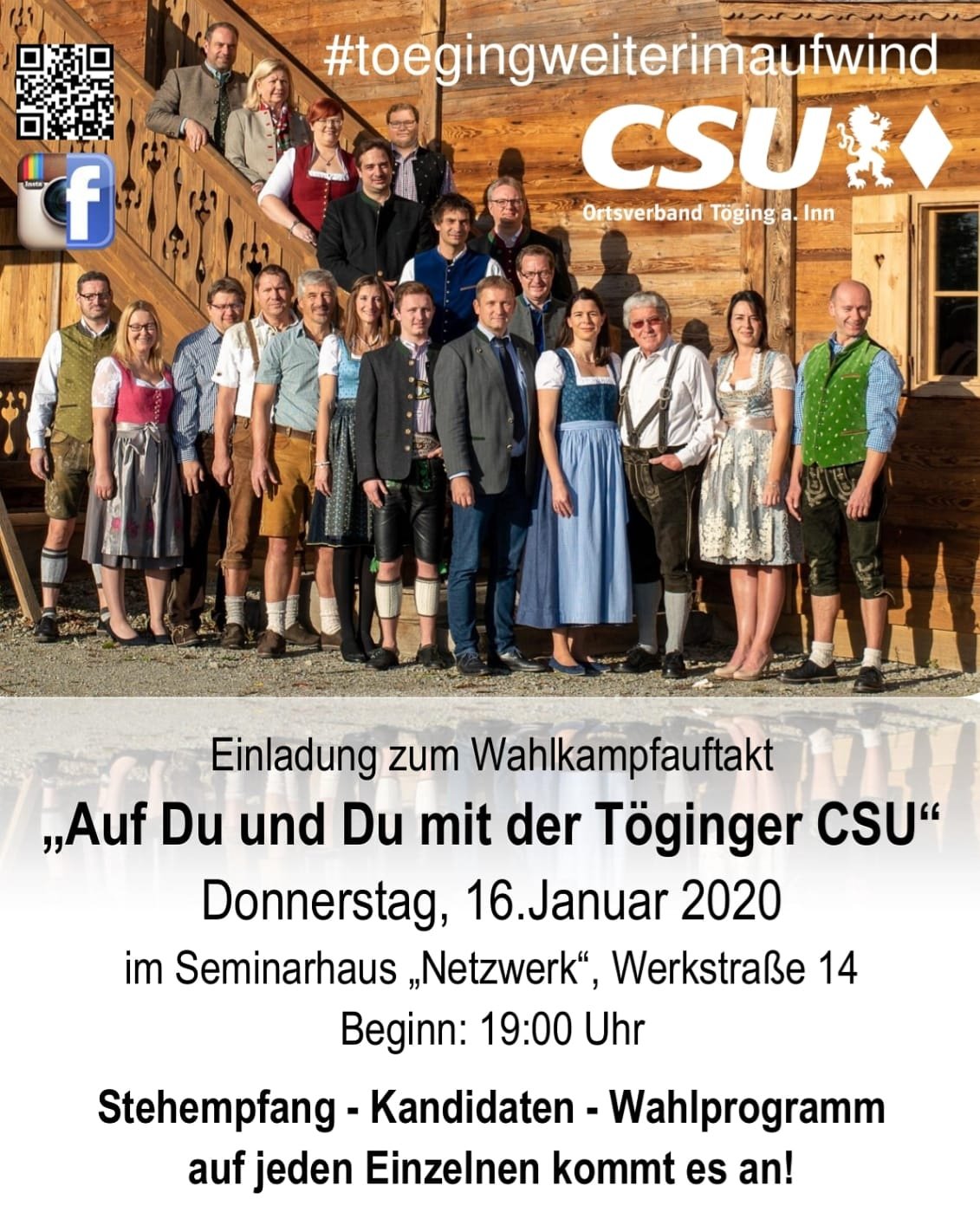 « Alle Veranstaltungen Diese Veranstaltung hat bereits stattgefunden. „Auf Du und Du mit der Töginger CSU“ Wahlkampfauftakt 16. Januar 2020 @ 19:00 - 22:00 kostenlos « Kamingespräche Geocaching Töging » + zu Google Kalender hinzufügen+ Exportiere iCal Details Datum: 16. Januar 2020 Zeit: 19:00 - 22:00 Eintritt: kostenlos Veranstalter CSU Ortsverband Töging a. Inn Veranstaltungsort Seminarhaus Netzwerk Werkstraße 14 Töging, Bayern 84513 Demokratische Republik Kongo + Google Karte Website: www.csu-toeging.de