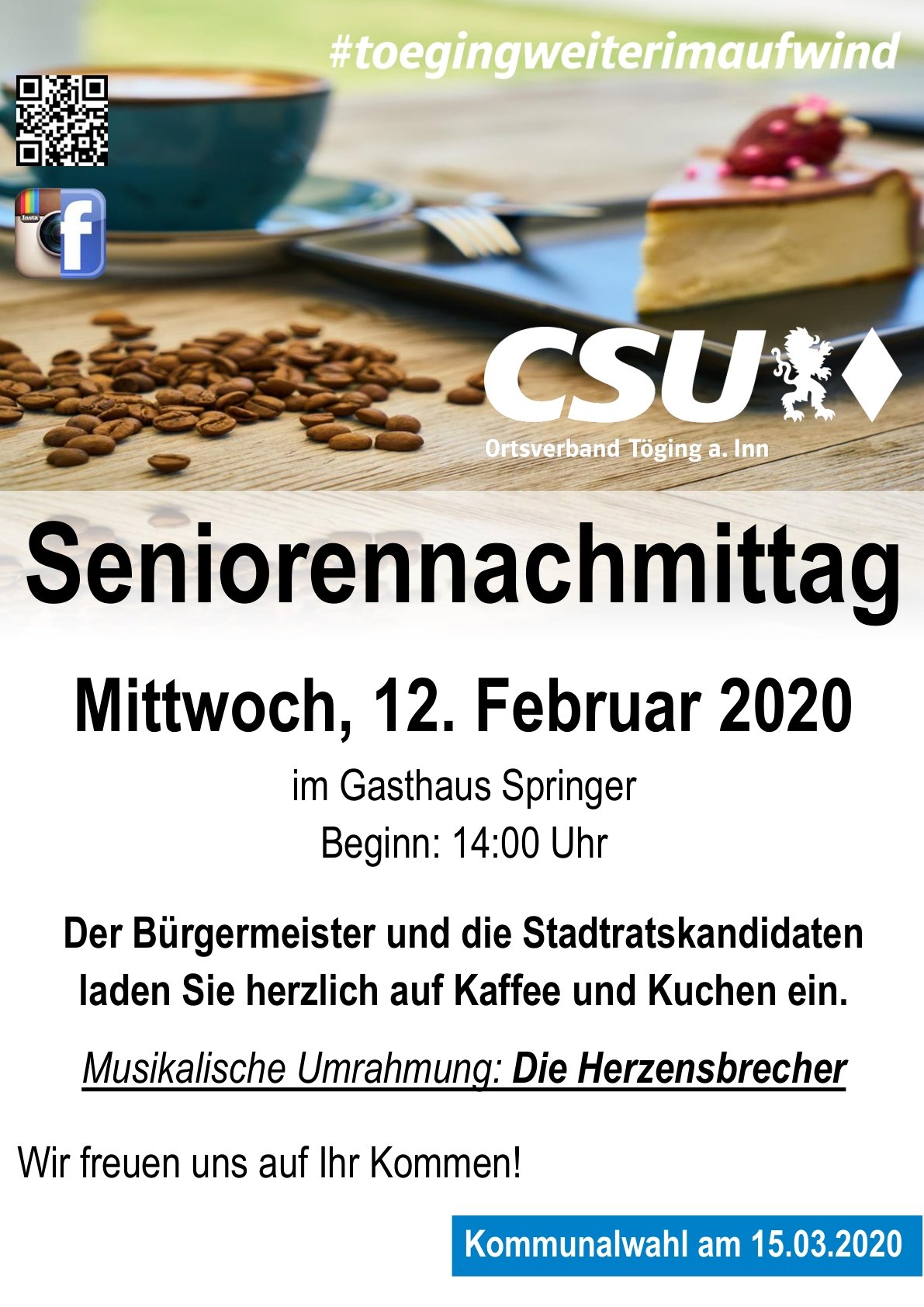 Die CSU-Töging lädt herzlich zum Seniorennachmittag ein. Der Bürgermeister und die Stadtratskandidaten werden auch ihren persönlichen Lieblingskuchen, die auch im CSU-Backbuch zu finden sind,  backen und  servieren. Musikalisch wird der Nachmittag im Gasthaus Müllerbräu von den „Herzensbrechern“ umrahmt. Wir freuen uns auf Ihren Besuch!