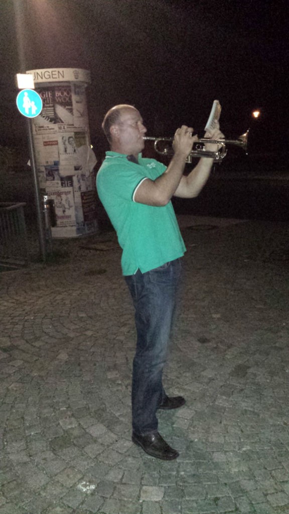 Wie schon am Nachmittag von ihm angekündigt, hat unser CSU-Mann Gottfried Grail nach dem Schlusspfiff mit seiner Trompete die Deutsche Nationalhymne und die Bayernhymne auf dem Rathausplatz gespielt. Euphorisierte Anwohner und Fußgänger riefen anschließend laut nach einer Zugabe. Die Stimmung war hervorragend, da auch ständig Autokorsos hupend den Rathausplatz passierten.